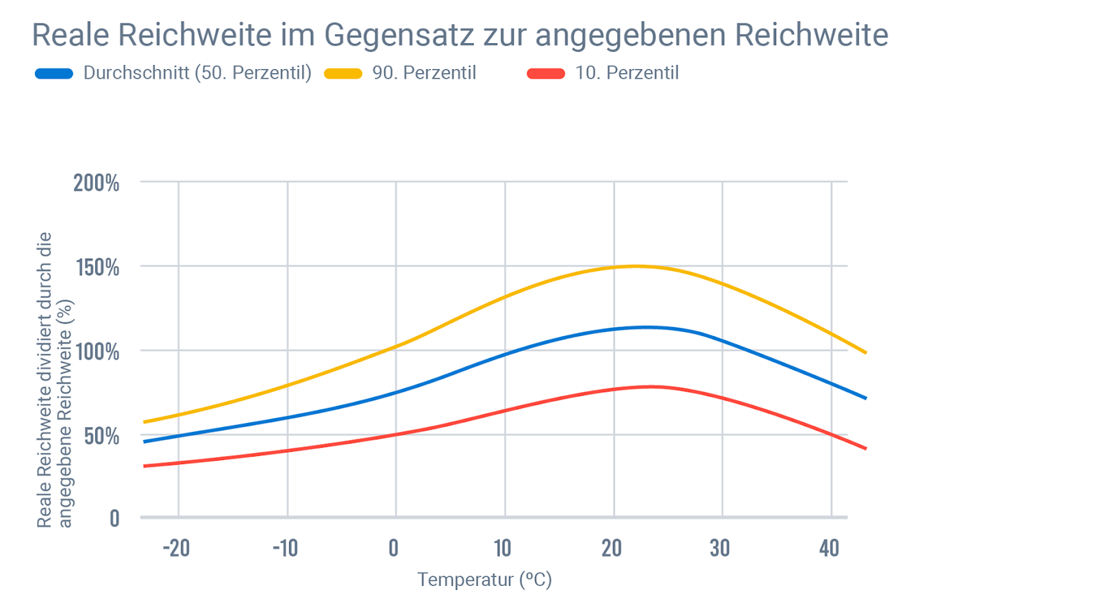 - Während sich sowohl niedrige als auch hohe Temperaturen auf die Reichweite auswirken, haben kältere Klimazonen einen größeren Einfluss.