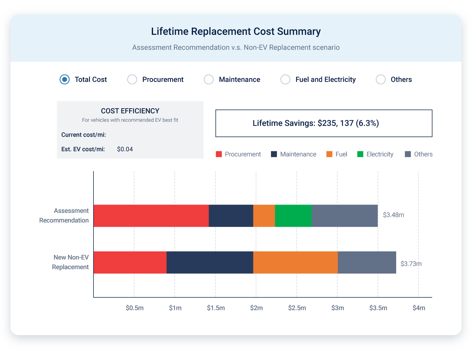 It’s wise to survey fleet electrification opportunities before acquiring EVs because it can help your agency scale EV adoption in a more cost-efficient and manageable way. Determine which ICE vehicles are the best candidates for EV replacement, forecast potential savings and choose effective EVs based on a variety of specific factors. One way to do this is with Geotab’s Electric Vehicle Suitability Assessment (EVSA), which takes into account charging locations, charging states and dwell times—as well as the preferences of your fleet—to help you build an ironclad business case for EVs. Compare EV costs and assess total cost of ownership (TCO) data with Geotab’s EVSA to make more informed financial decisions and help drive continued ROI. Conducting an EVSA makes navigating a path to sustainability simpler and more manageable to do, reducing the guesswork involved and providing you with a well-researched blueprint for electrification and cost savings. Additionally, you should look into how EV charging infrastructure will be set up or accessed for your fleet. Will your employees be doing at-home charging, or will you strategically place new charging stations in your region to support government vehicles? Asking these questions can help eliminate barriers and foster a smooth transition to EVs for your fleet.